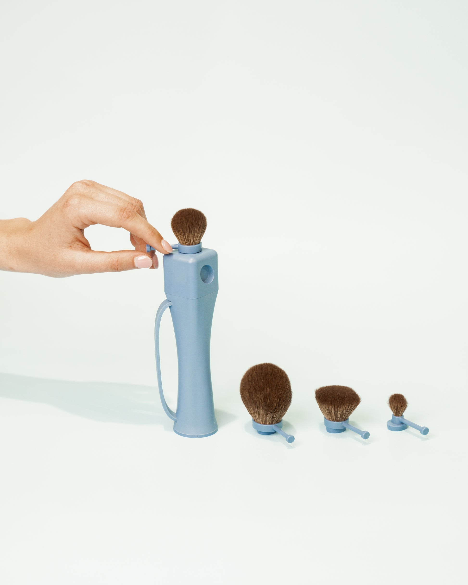 Four magnetic brush attachments: To be interchanged between all three positions. These include a foundation, powder, eyeshadow and blush/bronzer brush. Our blush/bronzer and foundation attachments are suitable for both cream and powder products.